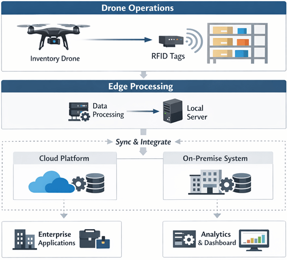 Automated Inventory Drone Systems follow a layered architecture that separates aerial execution, RFID data capture, processing logic, and enterprise integration. The architecture adapts to cloud and non-cloud deployments without altering flight operations or data semantics.