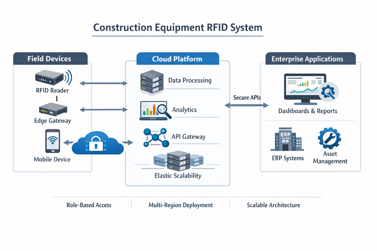 Construction Equipment RFID Systems integrate tagged physical assets, reader infrastructure, software platforms, and operational governance into a single asset intelligence framework. Equipment identifiers become system-recognized credentials tied to job codes, work orders, operator authorizations, and maintenance states. Field activity, yard movements, and cross-site transfers are digitally logged, reducing manual reconciliation across spreadsheets, paper logs, and disparate ERP modules.
