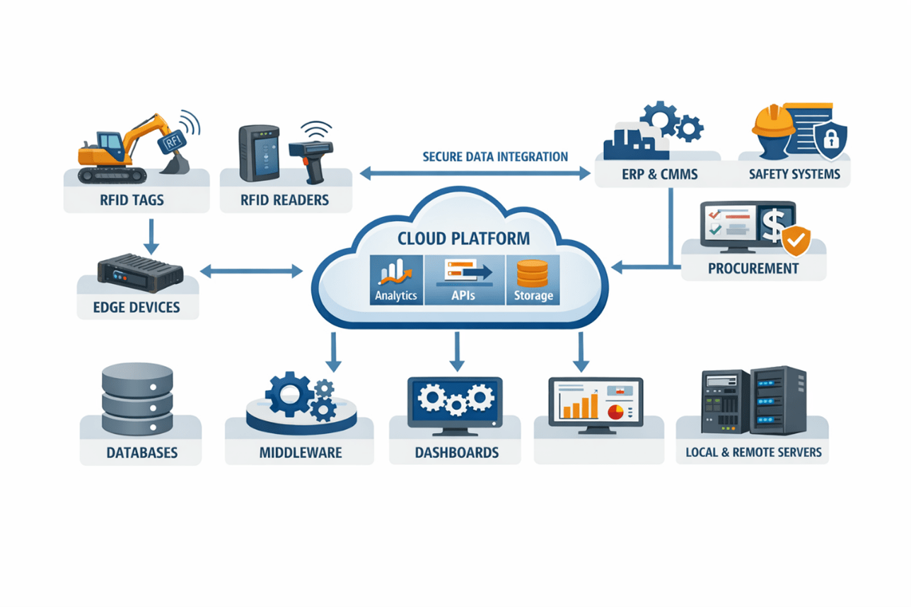 The platform supports multiple RFID technologies selected based on read range, environmental exposure, and asset form factor, while maintaining a unified operational model. Data collection can occur through mobile readers, fixed portals, or embedded checkpoints, feeding into configurable software layers. Deployment flexibility supports both cloud-based environments and non-cloud implementations running on handheld computers, PCs, local servers, or remote servers. This architectural adaptability allows construction enterprises to align with regulatory constraints, connectivity limitations, and internal IT governance models without sacrificing system integrity or operational continuity.