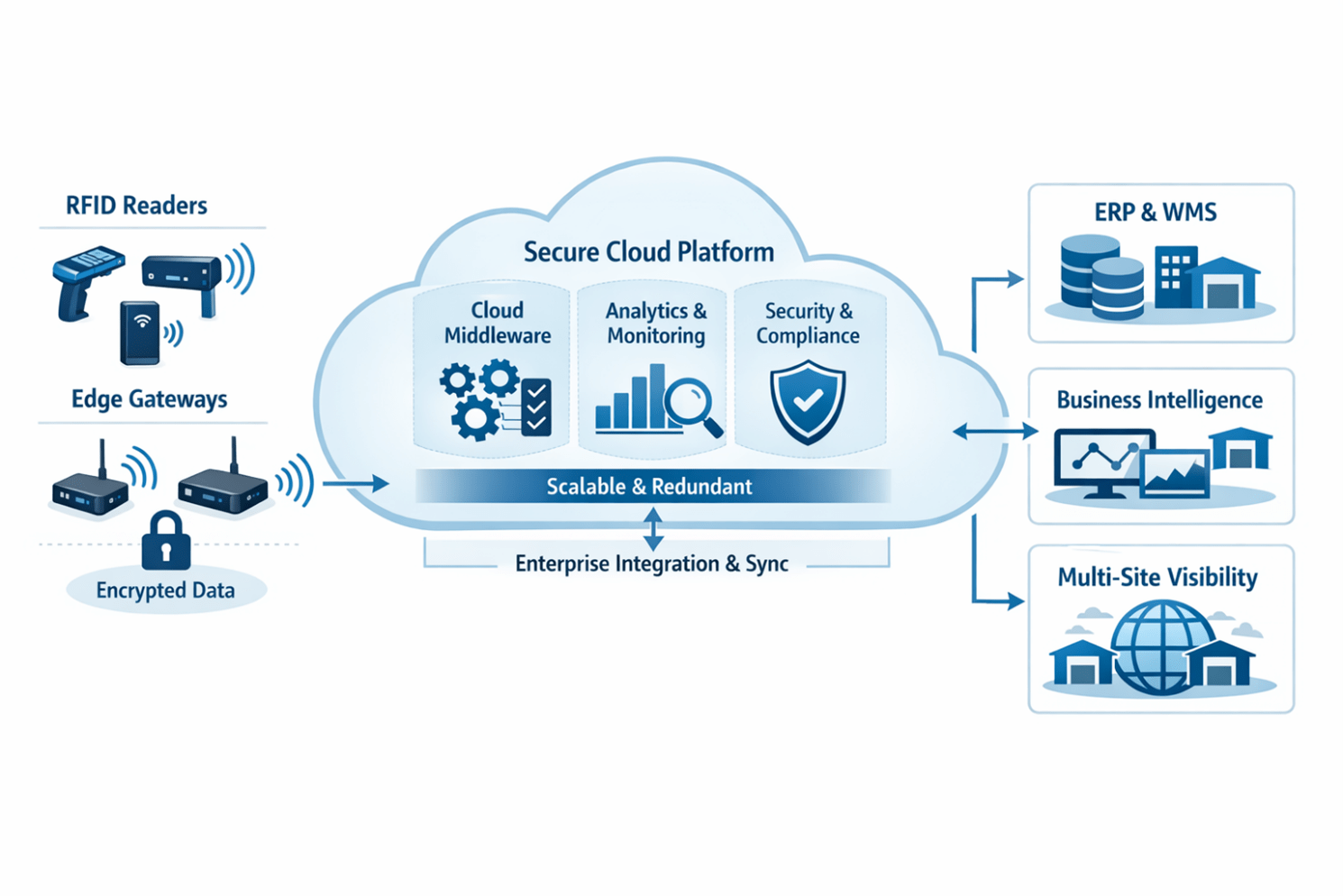 Cloud-based RFID cycle counting architectures centralize inventory logic, analytics, and governance layers in a secure cloud environment. RFID readers and edge devices transmit validated read events to cloud services through encrypted channels. Cloud-hosted middleware processes event streams, applies business rules, and synchronizes inventory states with enterprise systems.