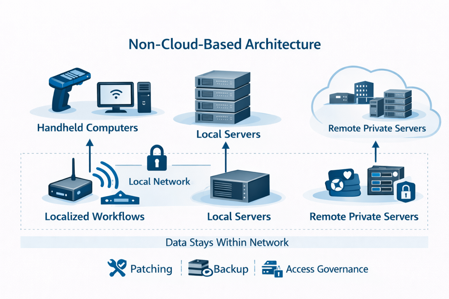 Non-cloud RFID cycle counting architectures are deployed where data sovereignty, latency control, or operational independence is required. Software can run directly on handheld computers for localized counting workflows, on PCs for departmental inventory control, on local servers for facility-wide operations, or on remote private servers managed by the organization.